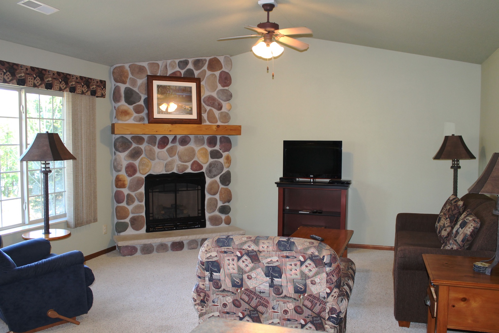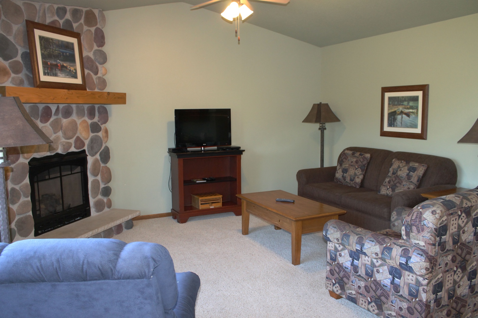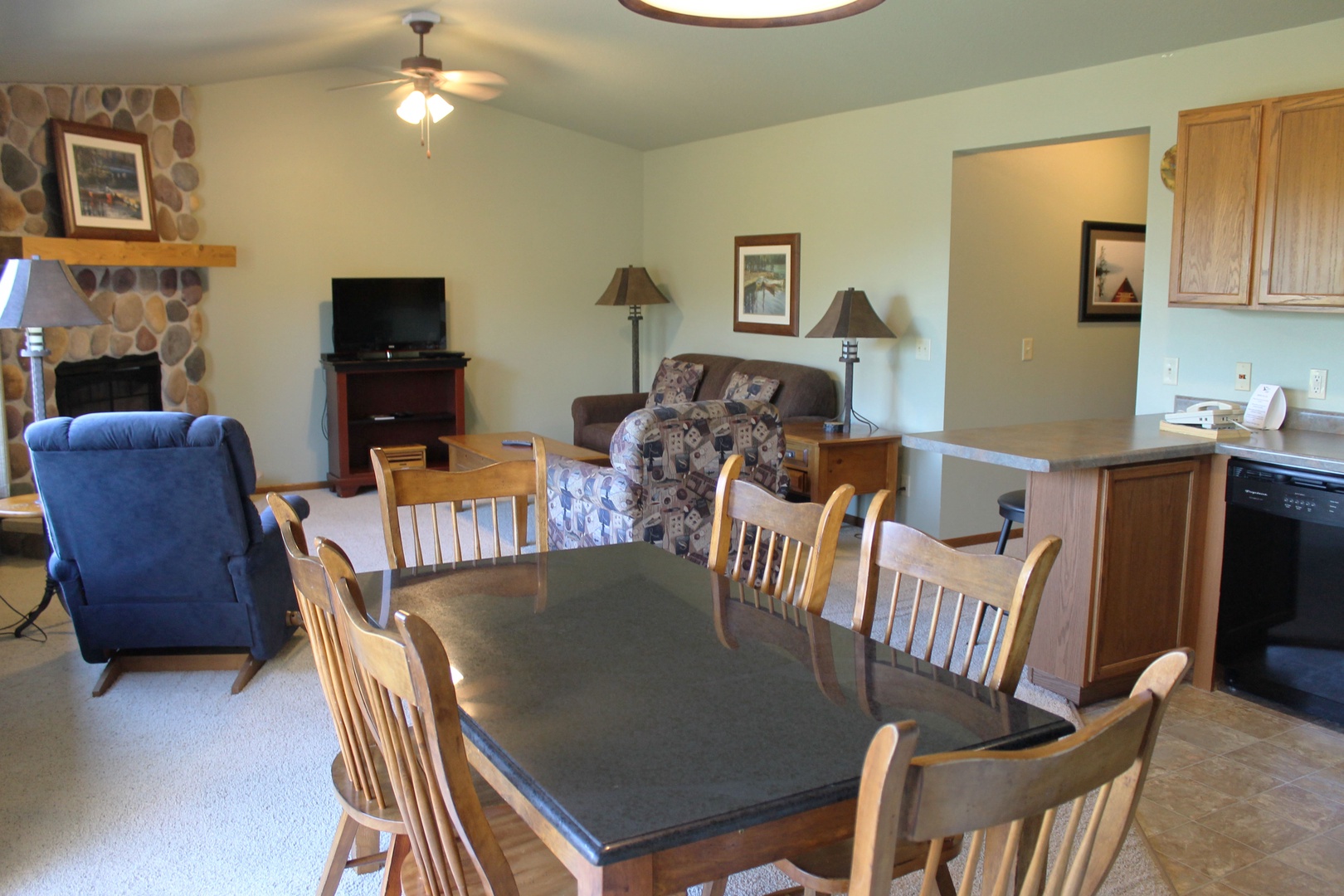 This 2-bedroom unit offers a heavily wooded view of Lynx Lake, located on the second floor you have a private balcony overlooking Lynx Lake and the property. Featuring a full kitchen, 2 full bathrooms, and 2 bedrooms, there is space for the whole family. The master bedroom has 1 king bed and attached bathroom, 2 twins in the second as well as a queen pull out sofa in the living room. The kitchen has full sized appliances and comes fully equipped. The living room has a gas fireplace to enjoy the view of the water from. Unit shares a charcoal grill on the parking lot side of building.