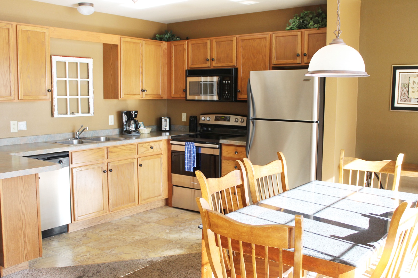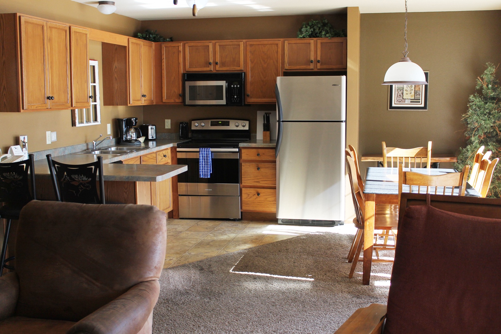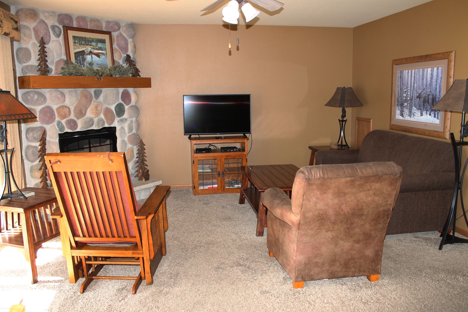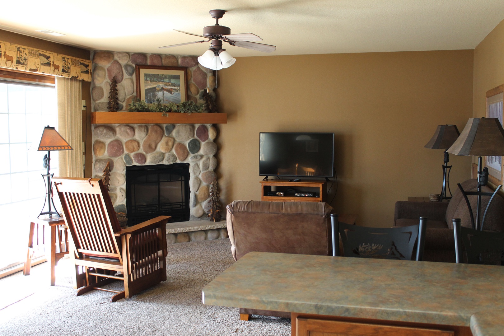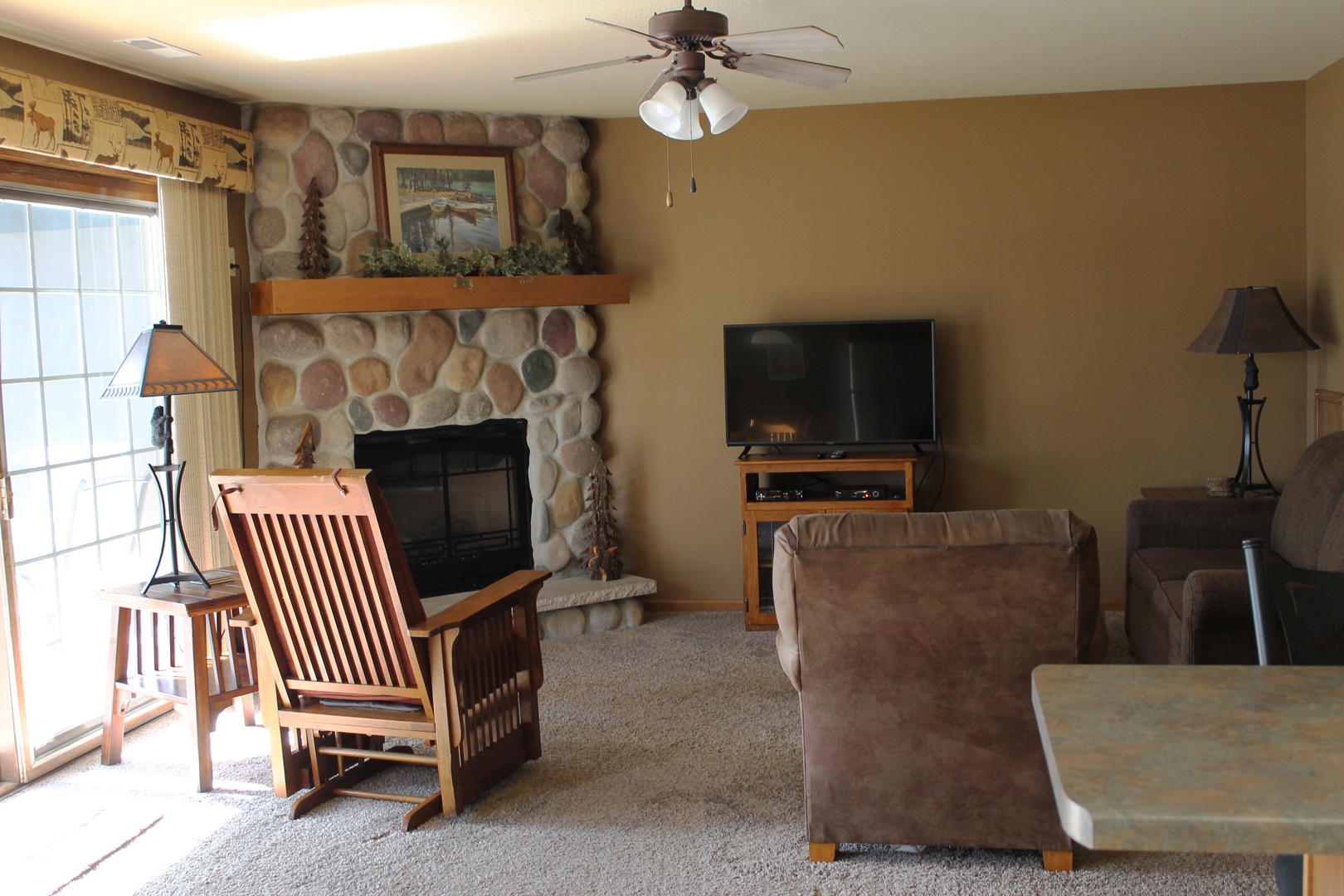 This 3-bedroom unit offers a great wooded view of Duck Lake, located on the ground floor you have walk out access to the lakefront of the property. Featuring a full kitchen, 2 full bathrooms, and 3 bedrooms. Featuring a master bedroom suite with king bed, 2 twin beds in the second bedroom, and a king bed in the third bedroom, and a queen pull-out sofa in the living room. Perfect for larger families or groups looking to stay together. The kitchen has full sized appliances and comes fully equipped. The living room has a gas fireplace to enjoy the view with an attached patio with table, chairs, and a charcoal grill