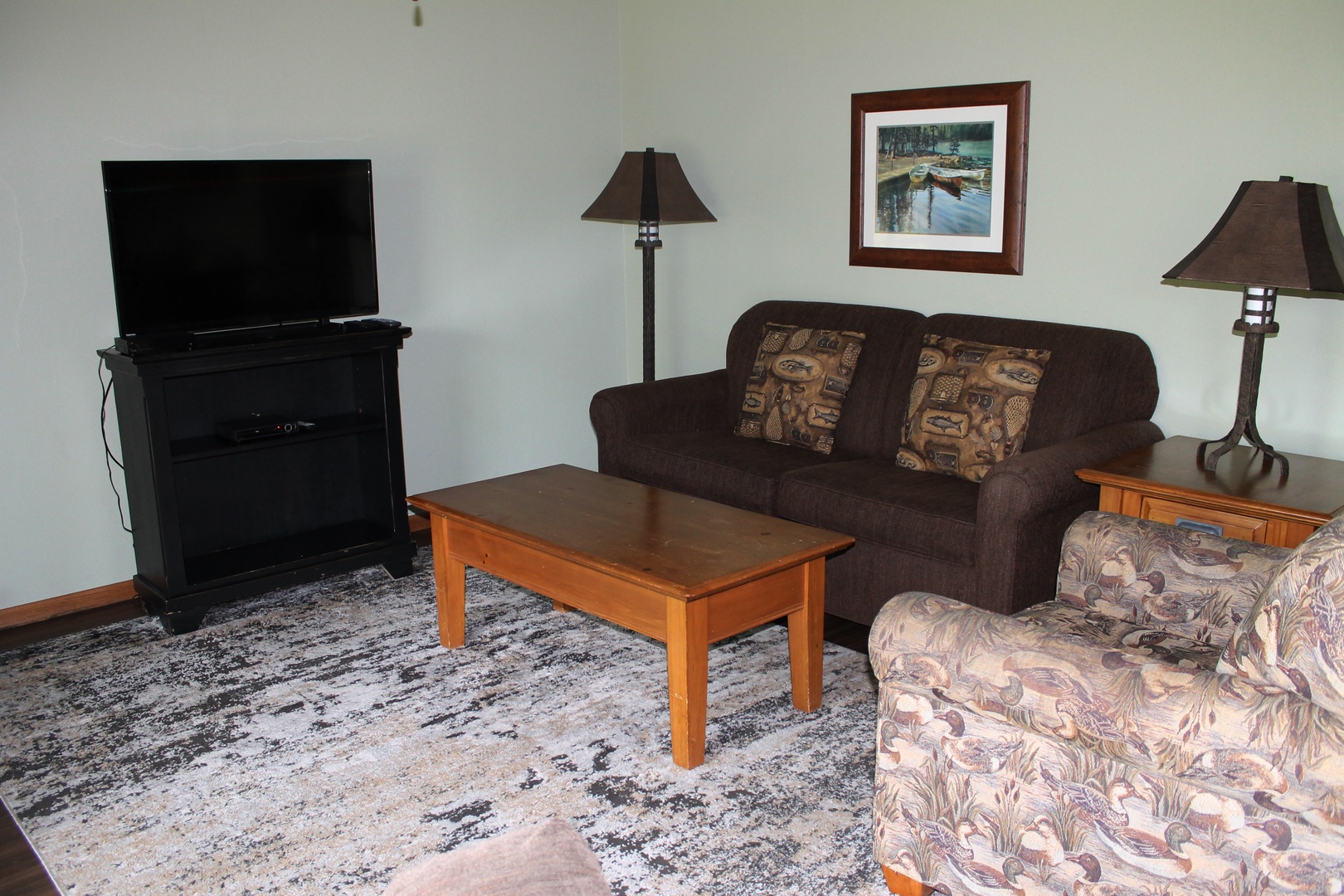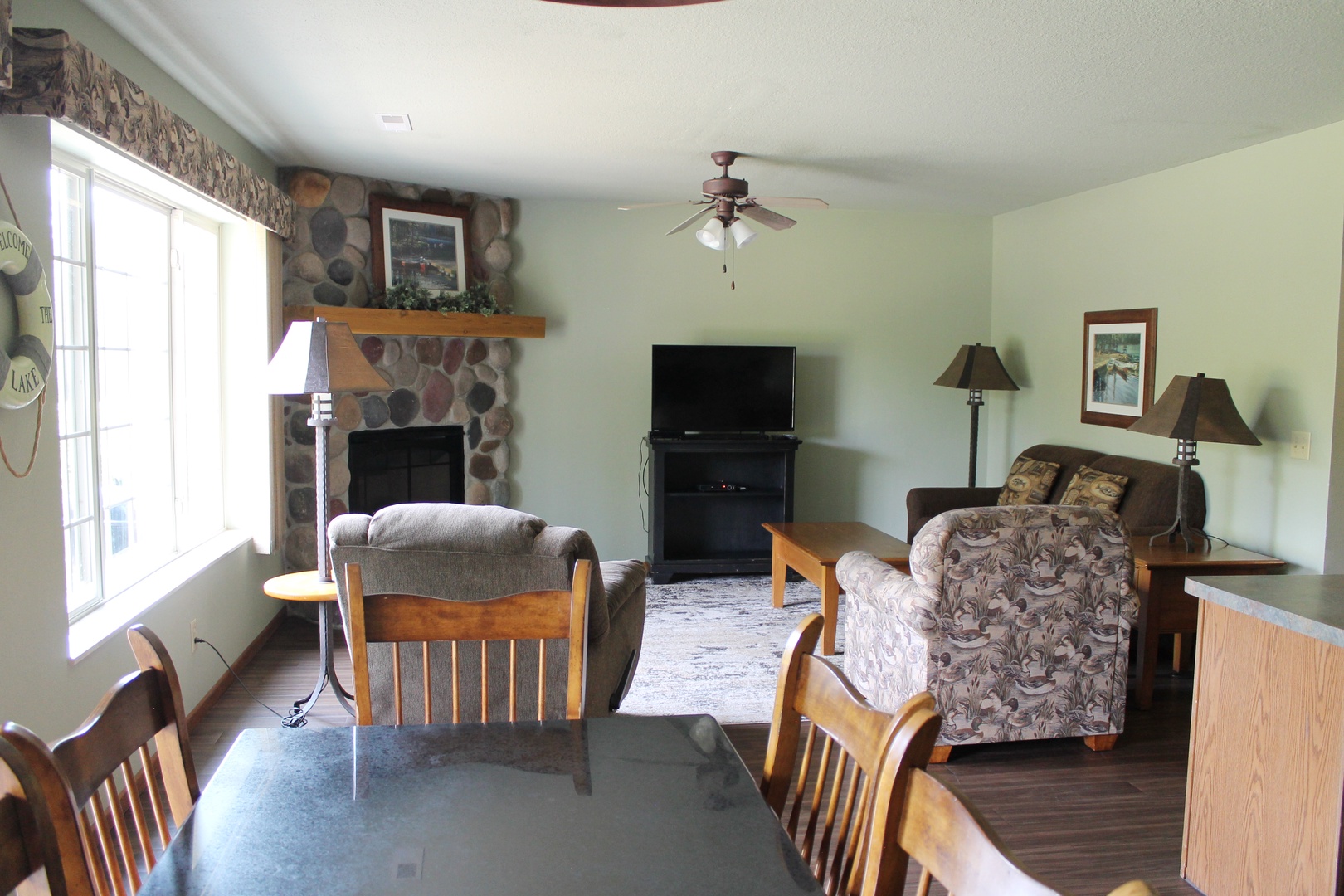 This 2-bedroom unit offers a heavily wooded view of Lynx Lake, located on the ground floor you have walk out access to the property. Featuring a full kitchen, 2 full bathrooms, and 2 bedrooms, there is space for the whole family. The master bedroom has 1 king bed and attached bathroom, 2 twins in the second as well as a queen pull out sofa in the living room. The kitchen has full sized appliances and comes fully equipped. The living room has a gas fireplace to enjoy the view with an attached patio with table, chairs, and a charcoal grill.