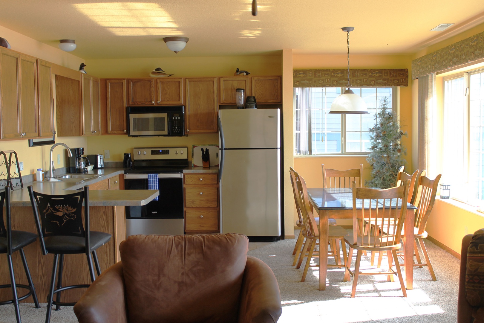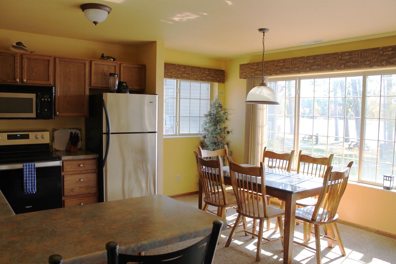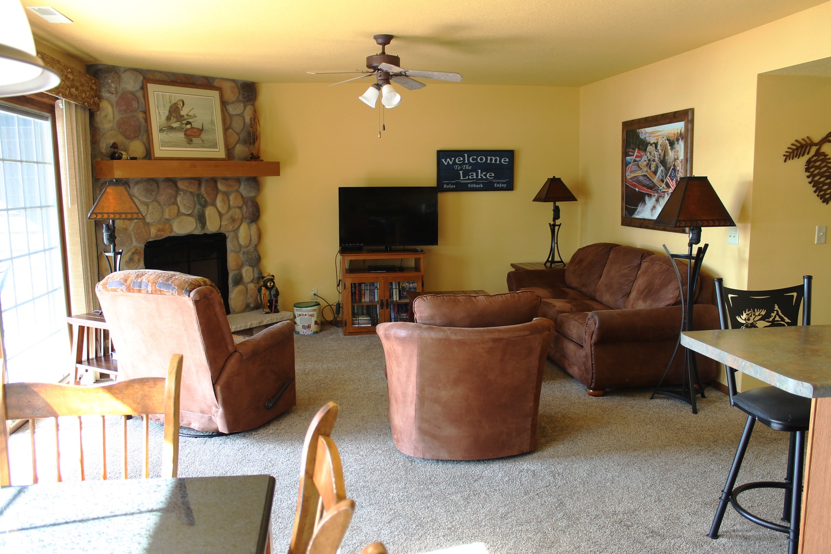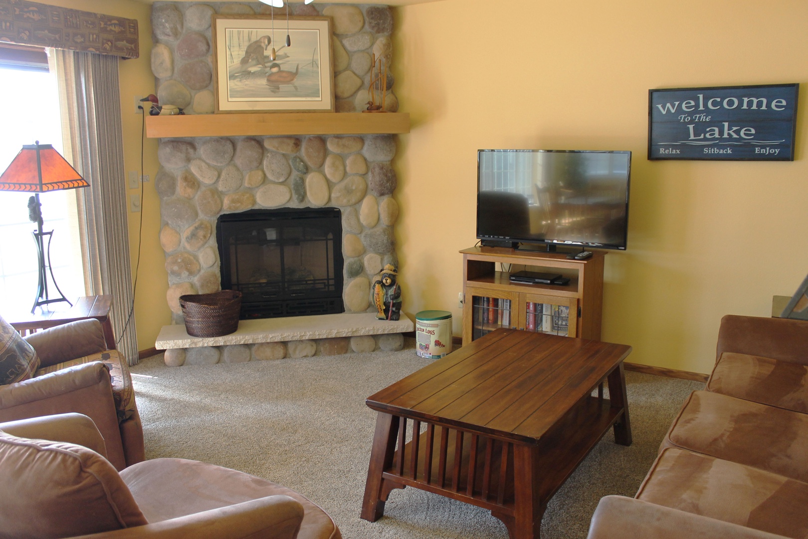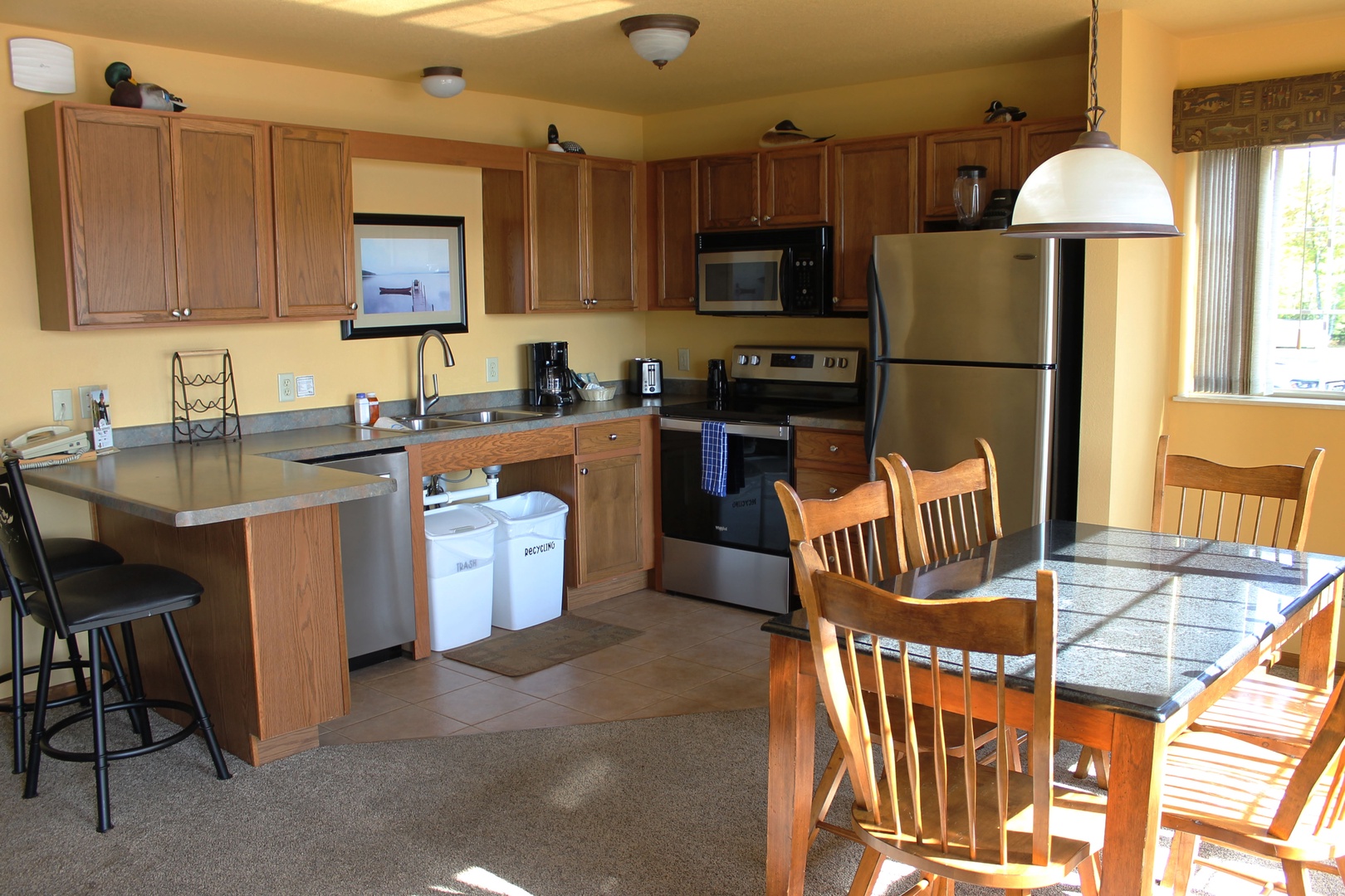 This 2-bedroom unit offers a great open view of Duck Lake, located on the ground floor you have walk out access to the lakefront of the property. Featuring a full kitchen, 2 full bathrooms, and 2 bedrooms, there is space for the whole family. The master bedroom has 1 king bed and attached bathroom, 2 twins in the second as well as a queen pull out sofa in the living room. The kitchen has full sized appliances and comes fully equipped. The living room has a gas fireplace to enjoy the view by with an attached patio with table, chairs, and a charcoal grill. This unit has an accessible floorplan, with grab bars in the bathrooms, open cabinets and sink area.